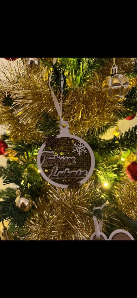 Beautiful three-layer wooden ornament combining festive patterns, white snowflakes, and your personalized name on top.